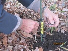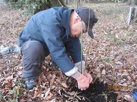 先日は6本の苗木が植付けられましたが、今回は「ウズマザクラ」の苗木1本をいただきました。駐車場奥の南の森に植えた「ヤマザクラ」の手前に植え付けていただきました。今は、まだ1メートル程の苗木ですが、この苗木も数年後にはすばらしい花が咲くことでしょう。