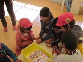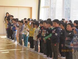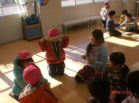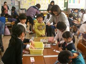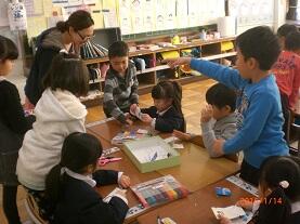 1月14日の午前中、氏家幼稚園児と第2氏家さくら保育園児の年長組の園児の皆さんを迎え、1年生児童との交流会を行いました。