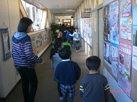 新校舎1階の多目的ホールでは、代表児童の歓迎の言葉の後、先日の音楽朝会でも発表した元気いっぱいの歌「おもちゃのチャチャチャ」を披露しました。その後、グループに分かれて“学校探検”に出かけました。1年生が、優しく手を引いて説明をしながら校舎内を案内する姿が微笑ましく思えました。