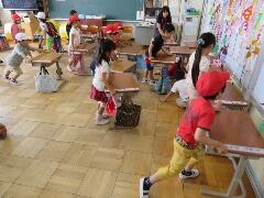 朝の活動の時間を利用し、竜巻シェルター作りの練習を行いました。担任が作り方の説明を行い、1分間以内を目標にして何度も練習しました。子どもたちは有事に備え、一生懸命取り組んでいました。(担当:岡崎教諭)