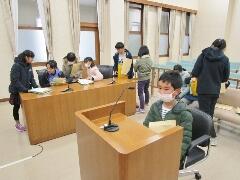 普段なかなか行くことのない裁判所では、移動のたびに「静かにお願いします。」と言われました。人はあちこちにいるのに、しんと静まりかえり、緊張して足を進めました。法廷の場にも入れてもらい、裁判官の姿になったり、弁護人や検察官のまねをしたりと楽しみながら活動しました。