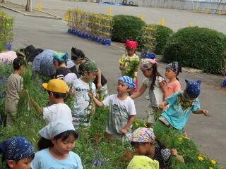 暑い中、先生と一緒に一生懸命に草むしりをしていました。この時期になると、一年生も清掃の時間立派な戦力です。