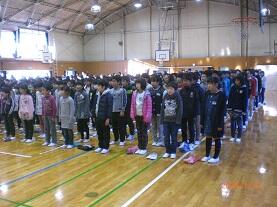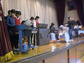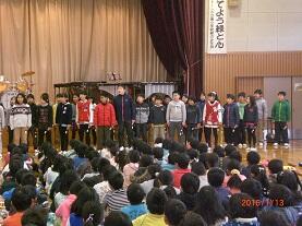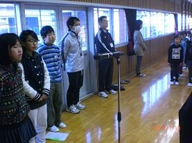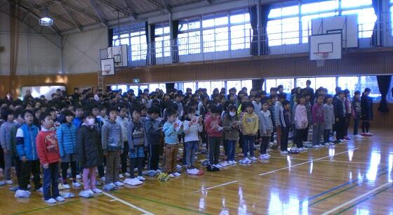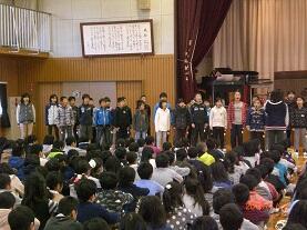 今朝は、厳寒(冷凍庫のような)の体育館での「音楽朝会」からスタートしました。今年度3回目の音楽朝会は、1年生と5年生の発表と全校生での合唱を行いました。