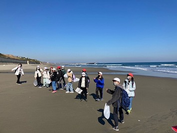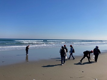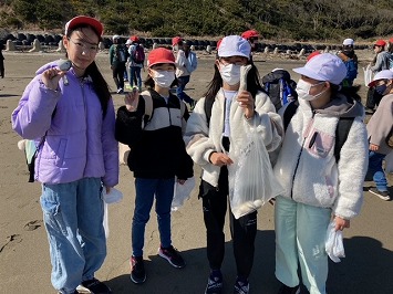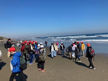 到着して初めての活動は、海岸散歩です。青い空と青い海。海のないとちぎっ子には、海と潮風を感じる絶好の機会です。砂浜では、流木や貝殻を見付けました。