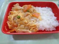 今日給食は、セルフ親子丼の登場です。親子丼という名前は、鶏の肉と、鶏の卵を使うことから「親子丼」とつけられました。鶏肉や玉ねぎ、油揚げを甘塩じょっぱく煮た所にを卵を入れとじました。