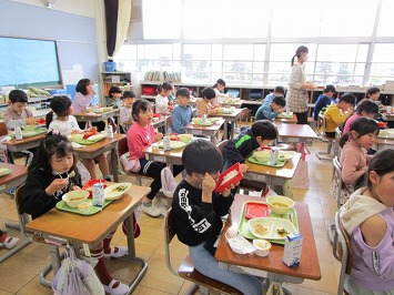 給食は、豚汁と二食丼でした。久しぶりの給食をおいしく、ありがたくいただきました。