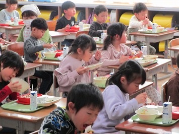給食は、みんな大好きなカレーでした。1年生も、もりもり食べていました。給食当番も上手にできました。