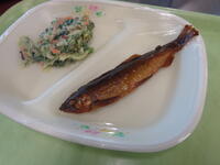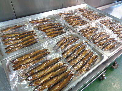今日の「鮎の甘露煮」は、地産地消の推奨目的のため、喜連川水産業者の方々より無償提供していただきました。さくら市の那珂川水系の清流が、天然の良い漁場で昔から川魚の養殖が盛んに行われています。新鮮な鮎を秘伝のタレでじっくり煮込みふっくらと仕上げた甘露煮なので、頭からよく噛んで食べると骨まで食べられます。タレがおいしいので、ごはんとよく合います。