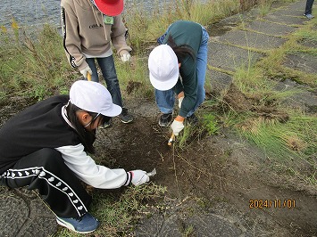 5年生が総合的な学習の時間「守ろう、地球の未来」の学習で、鬼怒川中流域の「礫河原」の自然保護活動の一環として「シナダレスズメガヤ」除去を体験をしました。