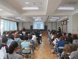 検査の間、保護者の方には多目的ホールに残っていただき健診と並行して「親学習会」と「入学までに身に付けておきたいこと」の説明を行いました。子育て支援の「親学習会」は生涯学習課が主催で実施し、家庭教育オピニオンリーダーの皆さんがコーディネーターとなり「子育ておしゃべり会」のワークショップ形式での話し合いを行いました。