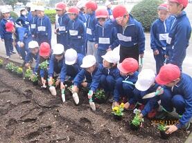 また、校舎前の各学年の花壇ではグリーン活動で「パンジー」の苗を移植する子ども達の姿がありました。明日の持久走大会のゴール付近を、色鮮やかなパンジーで飾ってくれました。