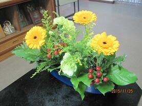 11月25日に、生け花ボランティアの方が見え、色鮮やかな黄色の「ガーベラ」と白い「カーネーション」の花、それに観葉植物の「ソリダコ」「レザーファン」と「レモンリーフ」、それから赤い実を付けた「ヒペリカム」を玄関に生けてくださいました。いつもいつも、ありがとうございます。