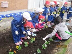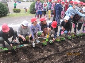 また、校舎前の各学年の花壇ではグリーン活動で「パンジー」の苗を移植する子ども達の姿がありました。明日の持久走大会のゴール付近を、色鮮やかなパンジーで飾ってくれました。
