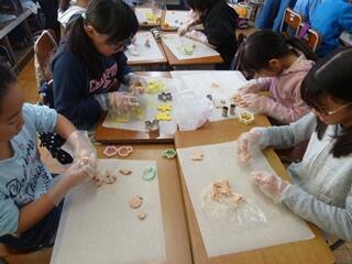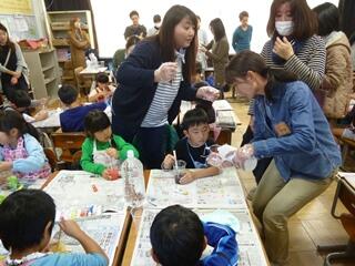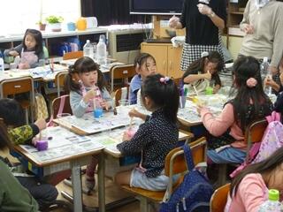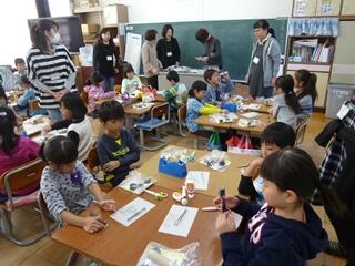 子どもまつりの会場に入ると、そこは子供達がよく知っている体育館とは全く違った空間になっていました。用意されたお店も、どこも一年生の興味をひくものばかりで、やさしく「おもてなし」されて、みんな大喜びでした。 (担当:三尾谷)