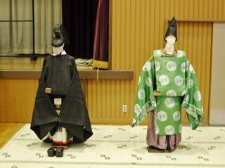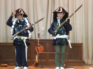 4年生から6年生の全体会では、6年生の代表児童が、昔の衣装や武具の着用体験を行いました。