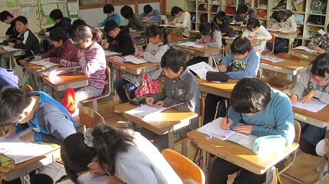 今日は、学力テスト2日目。みんな真剣なまなざしでテストに向かっています。
