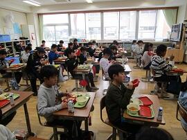 給食はいつものグループではなく、全員が前を向いて食べています。
