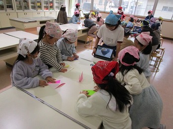 ボランティア委員が1・2年生と「折り紙」「じゃんけん列車」「なぞなぞ」で遊ぶ活動を行いました。