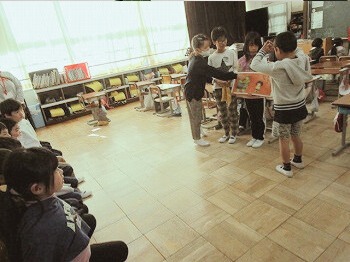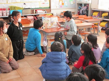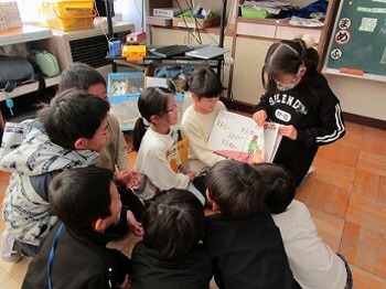 よ、1年生を前に読み聞かせを行いました。感情を込めた読み方や登場人物になりきって台詞を読むなど、グループご