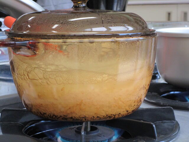 家庭では、スイッチオンでいつの間にかご飯が炊けているのですが、今回は、沸騰の具合や火加減の調整をしながら