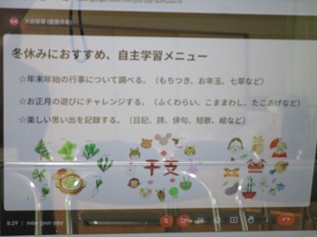 本日で第2学期前半が終了し、明日から冬休みを迎えます。オンライン朝会で校長から3つのお願いをしました。