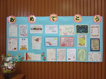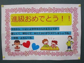 PTA役員のあいさつで迎えられながら、昇降口では、3年生と5年生のクラス発表がありました。