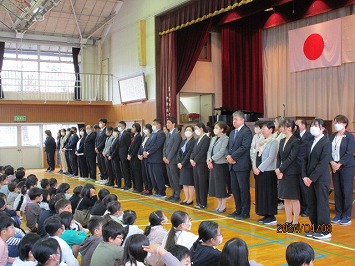 新任式では、6年生代表児童からの歓迎の言葉で、11名の新しい先生方をお迎えしました。