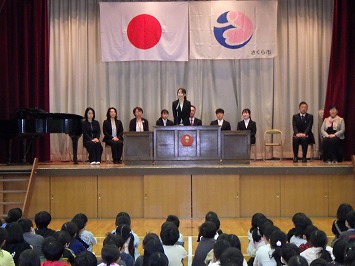 教育委員会教育委員様、副市長様、議会議員様、PTA役員の方々、地域でお世話になっている方々にご臨席いただき、かわいい1年生を迎えることができました。1年生は、担任からの呼名に元気よく「はい」と返事ができました。