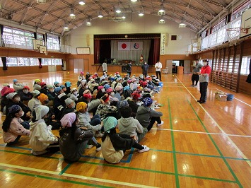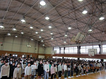 2年生から5年生までが5年ぶりに体育館に集まり、対面での新任式、始業式を行いました。元気いっぱいの明るいあいさつが体育館いっぱいに響き渡りました。