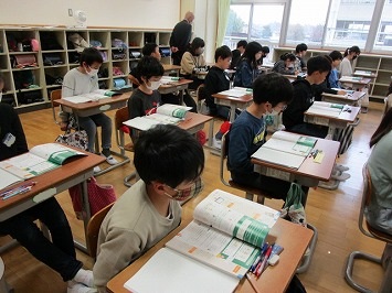 前の学年までに学習した内容がどれくらい身に付いているかを知るためのテストです。決められた時間の中で、問題に一生懸命取り組んでいました。