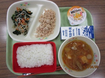 給食は、豚汁と二食丼でした。久しぶりの給食をおいしく、ありがたくいただきました。