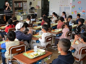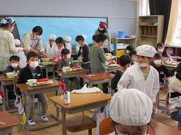 給食は、みんな大好きなカレーでした。1年生も、もりもり食べていました。給食当番も上手にできました。