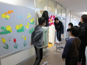 PTA役員のあいさつで迎えられながら、昇降口では、3年生と5年生のクラス発表がありました。