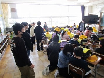 地震、火事の発生を想定して、避難訓練をしました。教室では、まず、地震が発生したときの身の守り方、火事が発生したときの避難の仕方を「お・か・し・も」の合い言葉を使って、その意味と理由を確認しました。