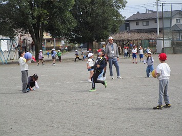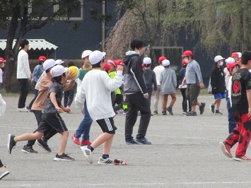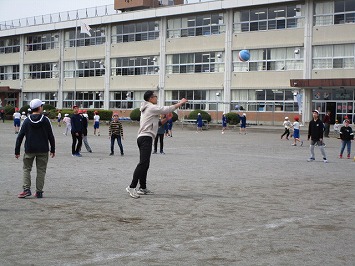 昼休みは、クラスの友達や先生たちと一緒に、ドッジボールや鬼ごっこで楽しく遊びました。みんな本気です!