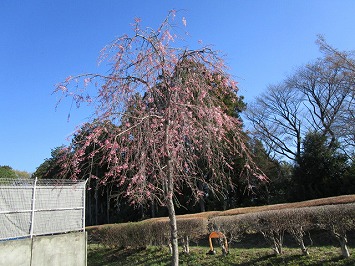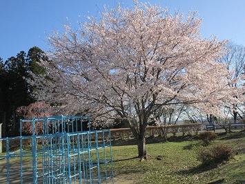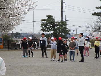 満開の桜の花の下で、元気いっぱいに体を動かしています。