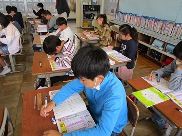 プリントを使っての学習では、前の学年で習ったことを思い出しながら、問題を解いていました。繰り返し学習することで、確実に身に付くことを目指しています。