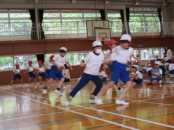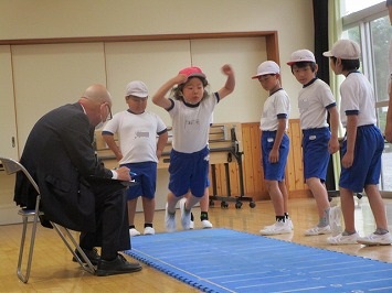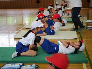 今日は2年生と6年生のペアで新体力テストを実施しました。2年生と6年生で手をつないだり、応援し合ったりしていました。