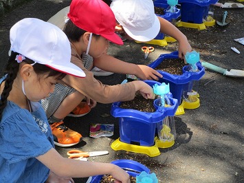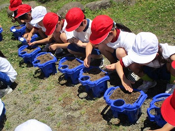 1年生がアサガオの種を植えました。先生のお話をよく聞いて、植木鉢の半分に土を入れ、次に肥料を入れて、また土を入れました。