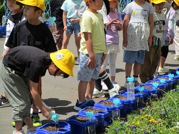 1年生から5年生は学年の花壇づくりを行いました。友達と協力して、紫サルビアとマリーゴールドを丁寧に植えました。