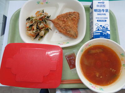 ごはん 牛乳 アジフライ ソース ごま酢和え ビルマ汁