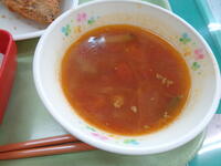今日は給食にビルマ汁が出ました。ビルマ汁とは、益子町の「もおかや」さんが作り続けている益子町の家庭料理です。「もおかや」さんの店主のお父さんが、太平洋戦争でビルマ(現在のミャンマー)に出征し、現地で食べたスープの味が忘れられず、帰国後再現して地域に広めた夏野菜たっぷりのスープです。カレー粉を使って肉や野菜を炒めているので、少しピリ辛いスープです。