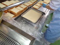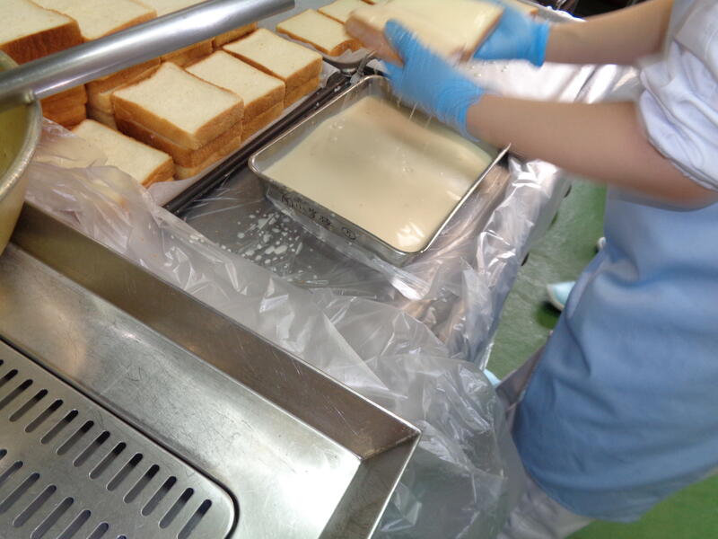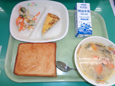 今日は、食パンをメープルシロップと牛乳を混ぜ合わせた液に漬け、オーブンで焼いた「メープルトースト」の登場です。給食室で調理員さんが、1枚、1枚液に漬け手作りしました。ほんのり甘いトーストで、児童からは、「おいしかったので、また給食にだしてください」との声が多数ありました。
