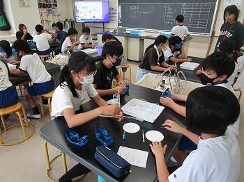 6年生の理科「水溶液の性質」の学習です。無色透明の何種類かの水溶液を、これまで学習してきた様々な方法を使って調べ、何の水溶液かを考える学習を行いました。グループの友達と協力して行いました。