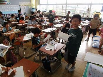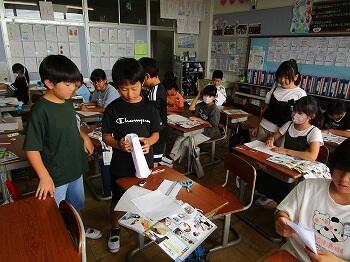 4年生:書写では、毛筆でひらがな「折れ」の練習で「らん」を書きました。理科「とじこめた空気や水」の学習で「浮沈子」を作りました。