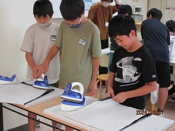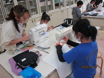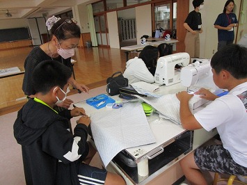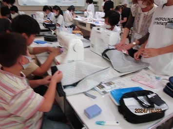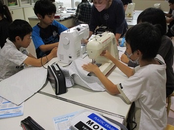 仮縫いを基に、慎重に丁寧にミシンをかけました。ボランティアさんに教えてもらったりグループで教え合ったりしながら、オリジナルの作品が仕上がりました。みんなとっても上手に縫えました。