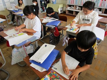 3年生の図工「立ち上がった絵の世界」の学習です。工夫して立ち上がらせた画用紙の表と裏に想像したことを表していく学習です。今日は、画用紙を工夫して立ち上がらせようと、一生懸命に考えました。