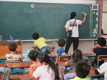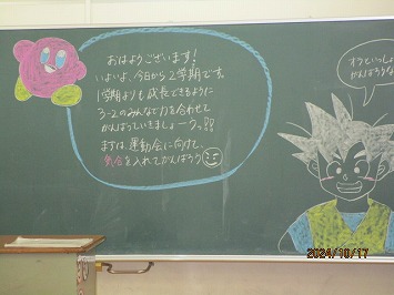 始業式では、写真とともに、これまでの子どもたちの姿から「自分のことだけでなく、相手のことや、クラスのこと、学校全体のことを考えて行動している人」たくさんいたことを紹介しました。2学期は、さらに素敵な学校にするために「周りの人のことや学校がよりよくなるには」と、一人一人が考えて行動してようと話しました。
