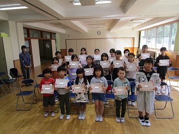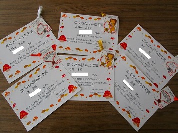 図書室に毎日のように通って、たくさんの本を読んだ人を表彰しました。各学年上位3名までの児童(6年生同位のため5人)20名に図書担当手づくりの表彰状としおりが贈られました。