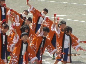 1・2生はダンスのポンポン、3・4年生はよっちょれソーランの鳴子、5・6年生は、手拍子で応援を盛り上げます。